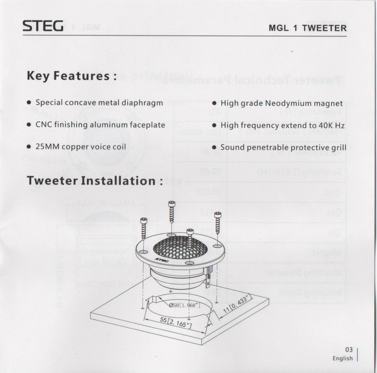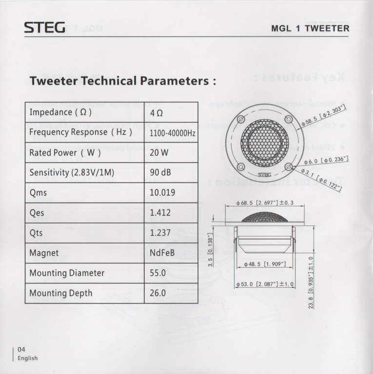 STEG MGL1 Артикул: 000 Производитель: STEG Количество: + - шт. Цена: 21780 руб. / шт. Добавить в корзину SQ твитеры STEG MGL1 Номинальная мощность: 20 Вт Диапазон воспроизводимых частот: 1100 - 40000 Гц Сопротивление: 4 Ом Чувствительность: 90 дБ Монтажная глубина: 26 мм Монтажный диаметр: 55 мм Qms: 10.019 Qes: 1.412 Qts: 1.237 INSTAGRAMS by @