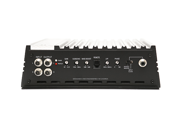 Лучший вариант схематехники, разработанный на базе производства в Южной Корее. Стабильно работает на нагрузку 1 Ом. Мощность 1000Вт на нагрузку 1 Ом, при напряжении 14.8 вольта и К.Н.И. на уровне ~5%, что является нормой для сабвуферного звена. Дистанционный регулятор уровня входной чувствительности имеет светодиодный индикатор превышения порога допустимых искажений. Возможна работа в режиме «мостового включения»