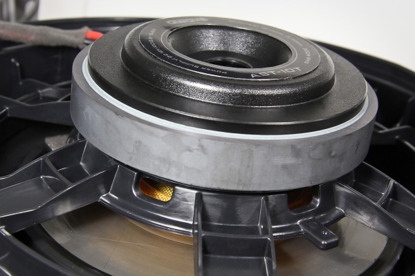 Сам излучающий диффузор – плоская алюминиевая «шайба», которая держится на традиционном подвесе по периметру и дополнительно – на центральном подвесе. Оба – резиновые. Номинальный диаметр динамика – 10 дюймов.