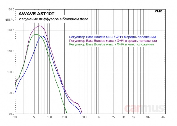Для проверки располагаю микрофон в ближнем поле – буквально в паре сантиметров от диффузора и снимаю характеристику излучения при разных положениях регуляторов.