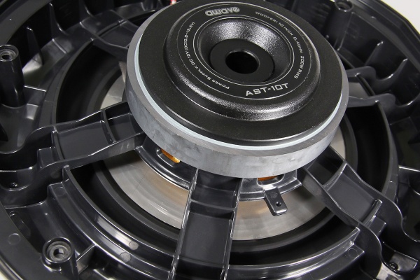 В случае же с Awave AST-10T решили не делать перед диффузором жёсткую конструкцию, динамик практически открыт, а акустической нагрузкой является само запасное колесо и, собственно, ниша, в котором оно расположено. Это сохраняет сам принцип акустической нагрузки диффузора, но эффективность излучения получается немного выше.