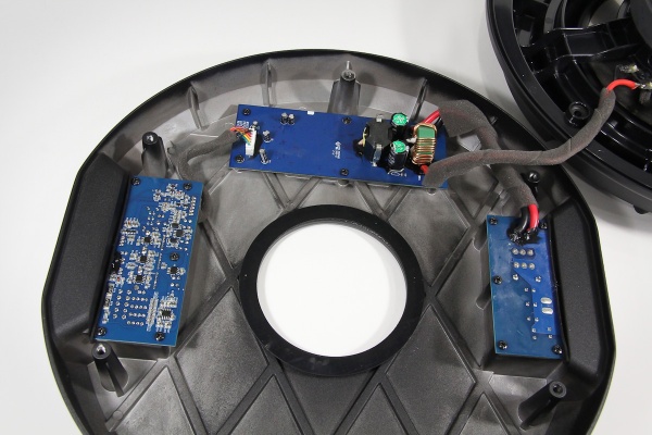 Связка усилитель/динамик здесь имеет одну важную примечательную особенность. Сам динамик имеет сниженный до 0,4 Ом импеданс. Это позволило сделать усилитель без повышающего преобразователя напряжения, получив при этом достаточную мощность. Последний, понятное дело, работает в D-классе.