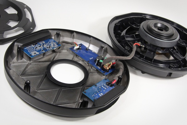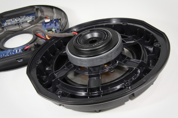 Сам динамик имеет, в принципе, вполне традиционную конструкцию на ферритовом моторе и с центрирующей шайбой. Правда, с довольно крупной звуковой катушкой. Калибр измерить затруднительно, но по прикидкам диаметр – плюс-минус что-то около 6 см.
