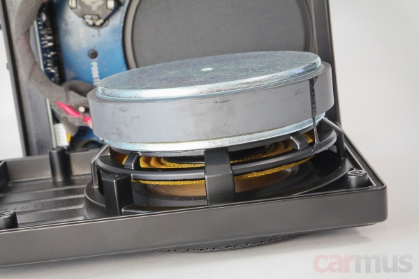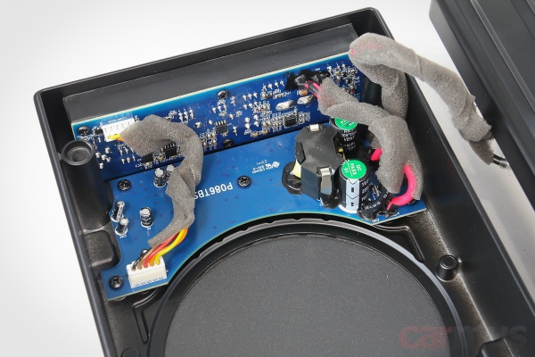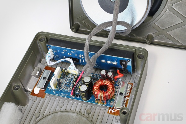 Теперь что внутри, для начала – модель V11 PRO. Акустическое оформление – закрытый ящик, корзины динамиков отлиты с корпусами как единое целое. Мотор – неожиданно солидный для подобных «подседельников», на огромном магните и с 2-дюймовой звуковой катушкой. Усилитель – АВ-класса.