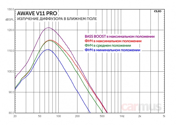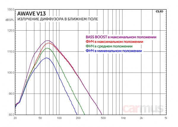 Для компактного V13 получилось иначе. Судя по всему, Bass Boost в нём настроен чуть ниже по частоте, так что заметного влияния на отдачу в основном рабочем диапазоне не происходит. Да, чуть повышается отдача в области 40-50 Гц, но это уже за пределами рабочего диапазона, и по факту влияние этой регулировки получается едва заметным.