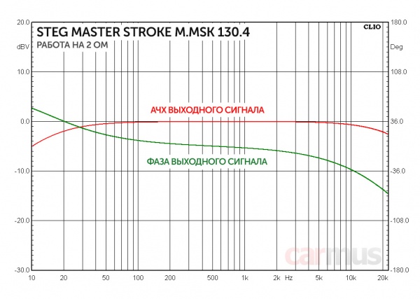 В этой части M.MSK 130.4 показал нетипичную для D-класса особенность. При переходе с 4-омной нагрузки на 2-омную выходной фильтр неизбежно оказывается настроенным на другую частоту, и это всегда видно на фазовой характеристике (ну и завал АЧХ на 2 Ом был бы заметнее).
