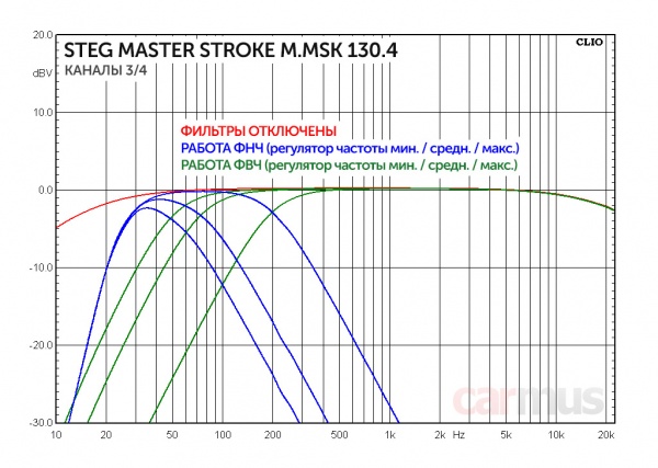 Проверку работы начну, как всегда, с фильтров – здесь они есть лишь в одной паре каналов. ФВЧ работает традиционно, и к нему вопросов нет. А вот при включении ФНЧ дополнительно включается необъявленный описанием сабсоник, решительно отсекающий неинформативный инфраниз. Будет нелишним при работе этой пары каналов на сабвуфер (а где ещё фильтр с такими пределами регулировки может пригодиться).