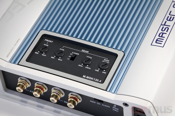 Все регулировки выведены на верхнюю плоскость корпуса. Их тут немного: для каналов 1/2 (здесь они по старинке названы Front) – только гейн, а для каналов 3/4 (типа, Rear) – ФВЧ или ФНЧ с возможностью выставить срез от 50 до 250 Гц.