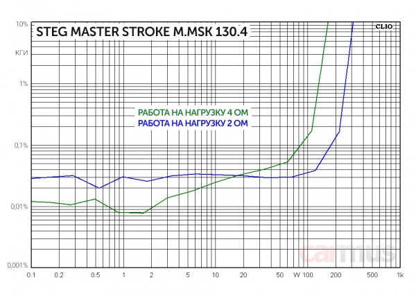 На 2-омную нагрузку КГИ слегка повышается на верхних частотах, но 2-омных твитеров, мягко говоря, немного (по крайней мере, в SQ ни одной модели не знаю), так что это не так актуально. А вот то, что НЧ уровень КГИ остаётся таким же, как на 4-омную нагрузку – очень хорошо.