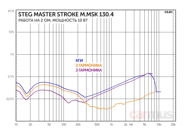 Теперь о том, каковы искажения на разных частотах. На СЧ, как водится, уровень КГИ ниже, но по всему диапазону в любом случае не вылетает за пределы сотых долей процента.