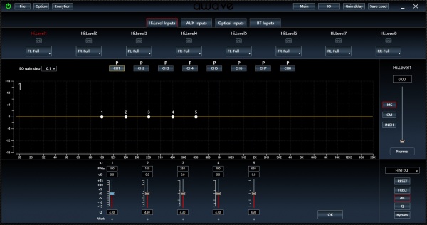 Во-первых, можно скорректировать каждый из каналов от всех источников. В каждом – по 5 полос параметрической эквализации (т. е. с выбором центральной частоты и ширины полосы регулирования).