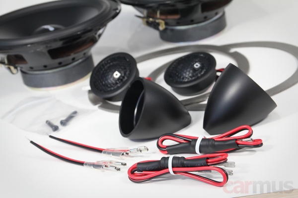 В комплекте идут симпатичные чашки-пульки для наружного монтажа, в которые твитеры просто вставляются и фиксируются с тыльной стороны винтами. Плюс всякие полезные монтажные мелочи. Часть кроссовера, отвечающая за твитеры, представляет собой конденсатор, выполненный в разрыв провода (ФВЧ первого порядка).