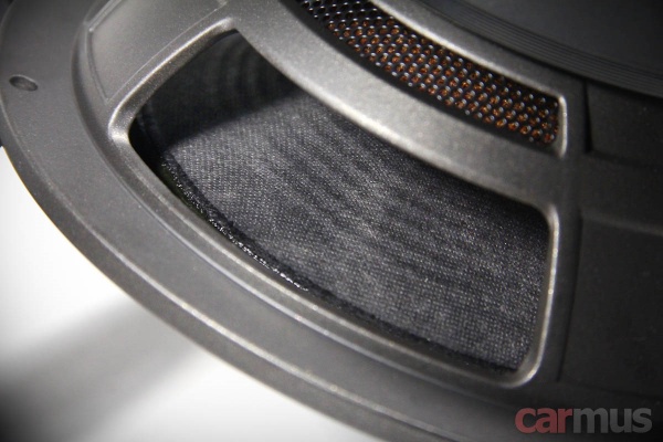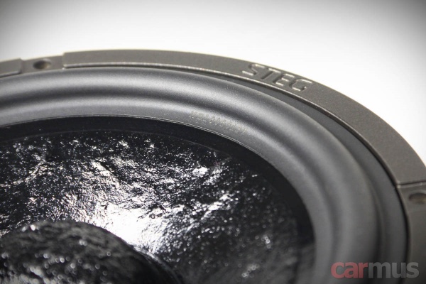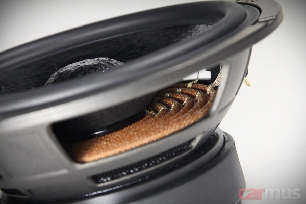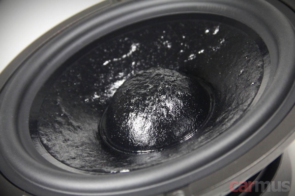 Первое, что привлекает внимание в НЧ/СЧ динамиках – крупный центральный колпак. Точнее, не столько крупный, сколько высокий, выглядит всё это очень непривычно. Материал диффузора – непрессованная целлюлоза с характерным рельефом лицевой части.