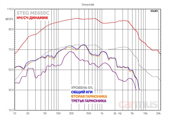 В спектре искажений преобладает вторая гармоника. Общий уровень выглядит слегка повышенным, но тут нужно учесть, что эти измерения я снимал далеко не на самой маленькой громкости.