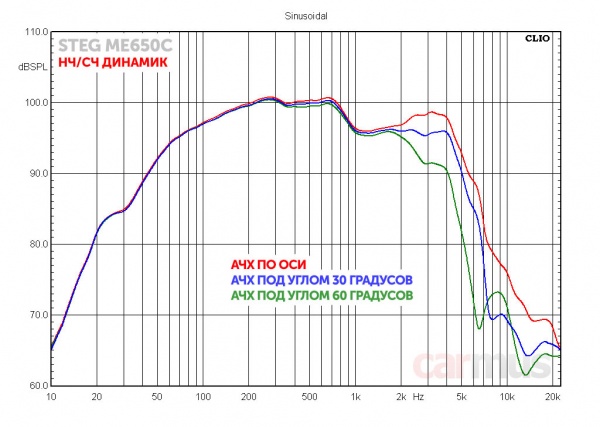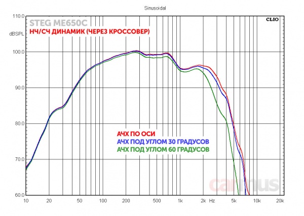 Традиционное измерение АЧХ в просторном корпусе, как и полагается для динамика с низкой добротностью, показало плавный спад внизу рабочего диапазона. Но как это проявляется на деле и как динамик работает в корпусе, коснусь чуть позже, сейчас важно другое – как динамик ведёт себя выше по диапазону.