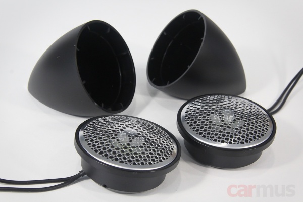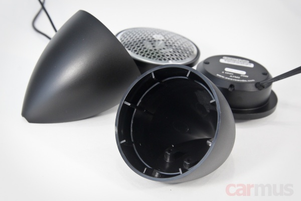 Излучатели небольшие, сопоставимы с обычными 2-дюймовыми динамиками. Внешний диаметр – ровно 7 см, монтажная глубина – 18,5 мм, а если считать от лицевой плоскости фланца – 24 мм. В комплекте идут пластиковые корпуса.