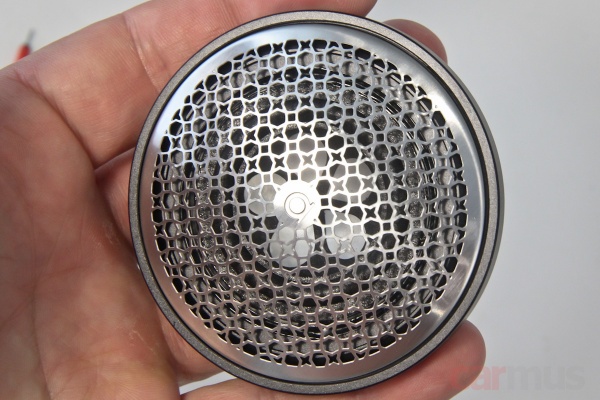 Сетки – несъёмные, вклеены намертво, так что оставил попытки снять их и попробовал подобрать ракурс для фото, чтобы хоть как-то подсветить диффузоры. Они тут имеют форму обращённого купола, выполнены из алюминия и частично покрыты бумажным слоем – «окна» в этом покрытии образуют форму «лепестков». Это помогает демпфировать резонансы или, проще говоря, устранить характерную звонкость алюминия.