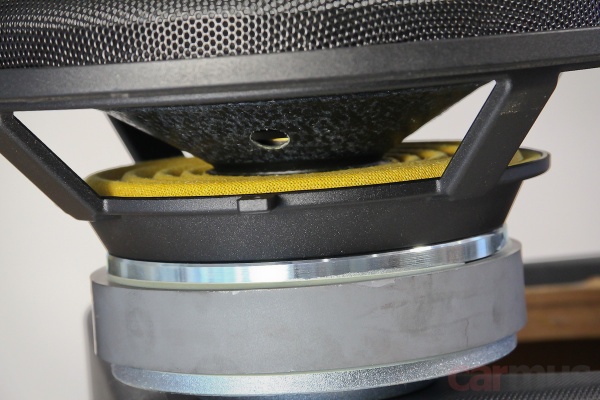 Динамик довольно интересный. В исполнении нет лишних украшательств, но с инженерной точки зрения всё по уму. Мотор – с толстой верхней шайбой магнитопровода (читай – с большой высотой магнитного зазора), что должно хорошо сказаться на контроле динамика усилителем. Привлёк внимание материал диффузора – целлюлозный композит с углеволоконным наполнением.